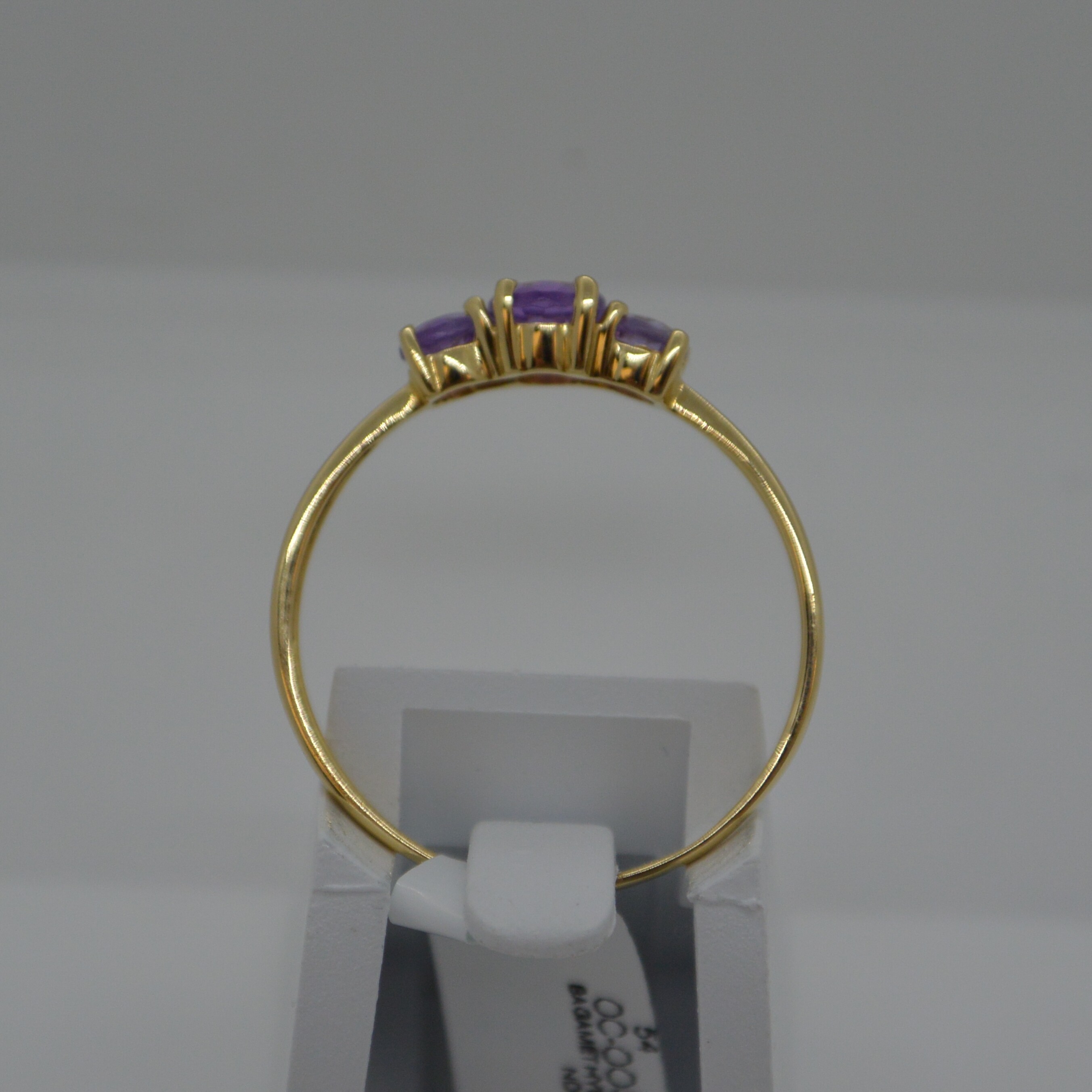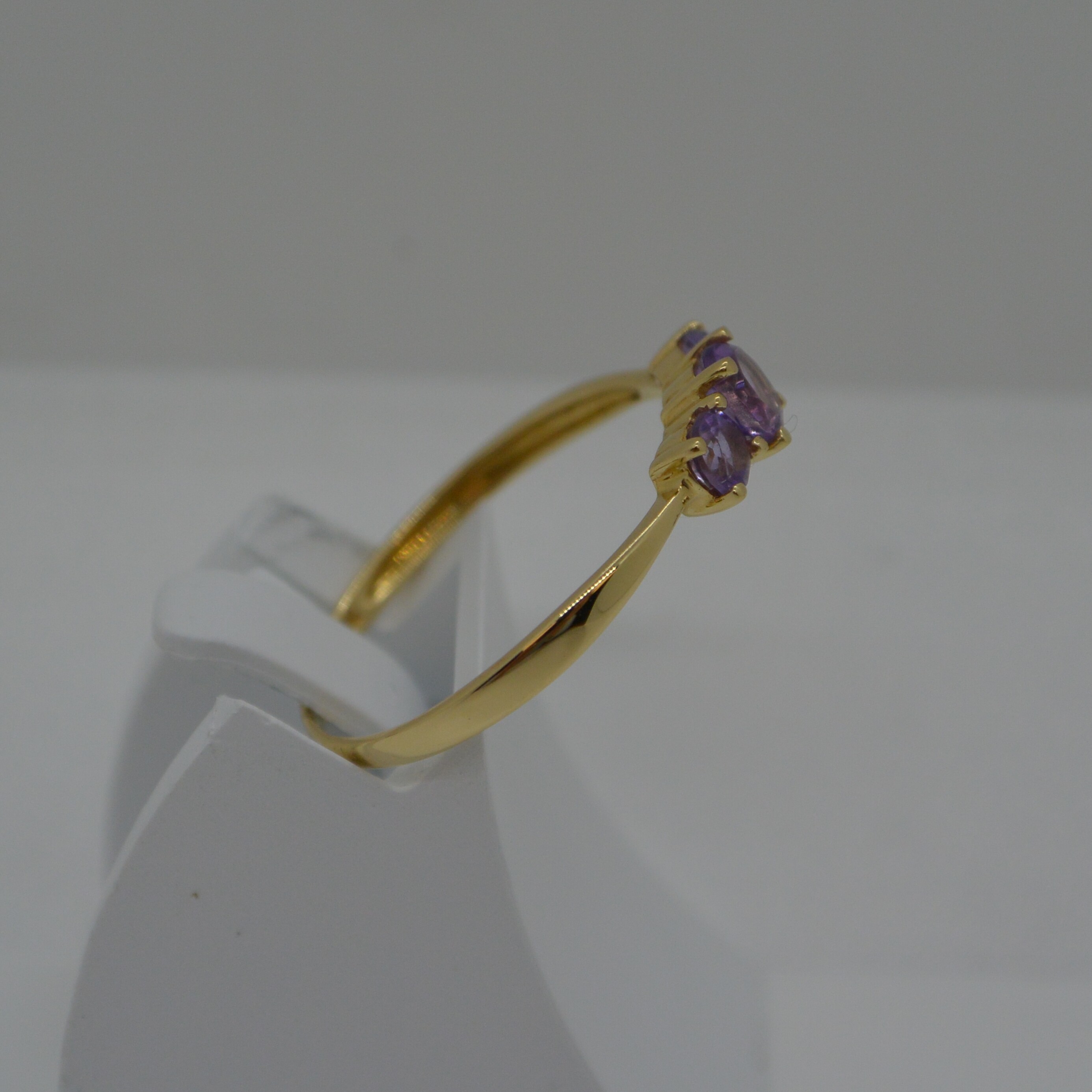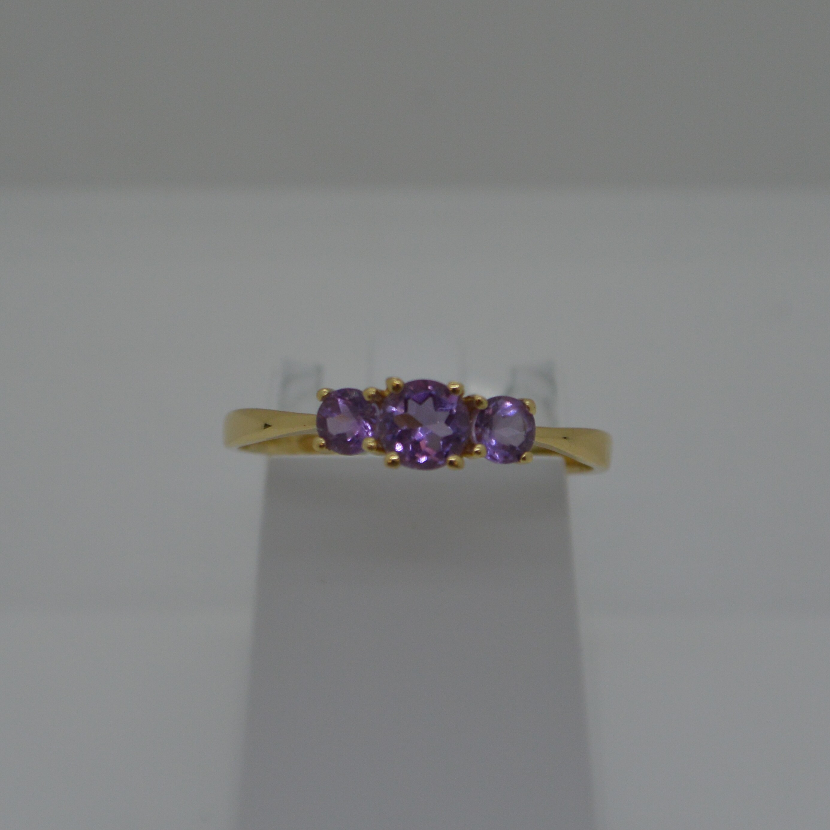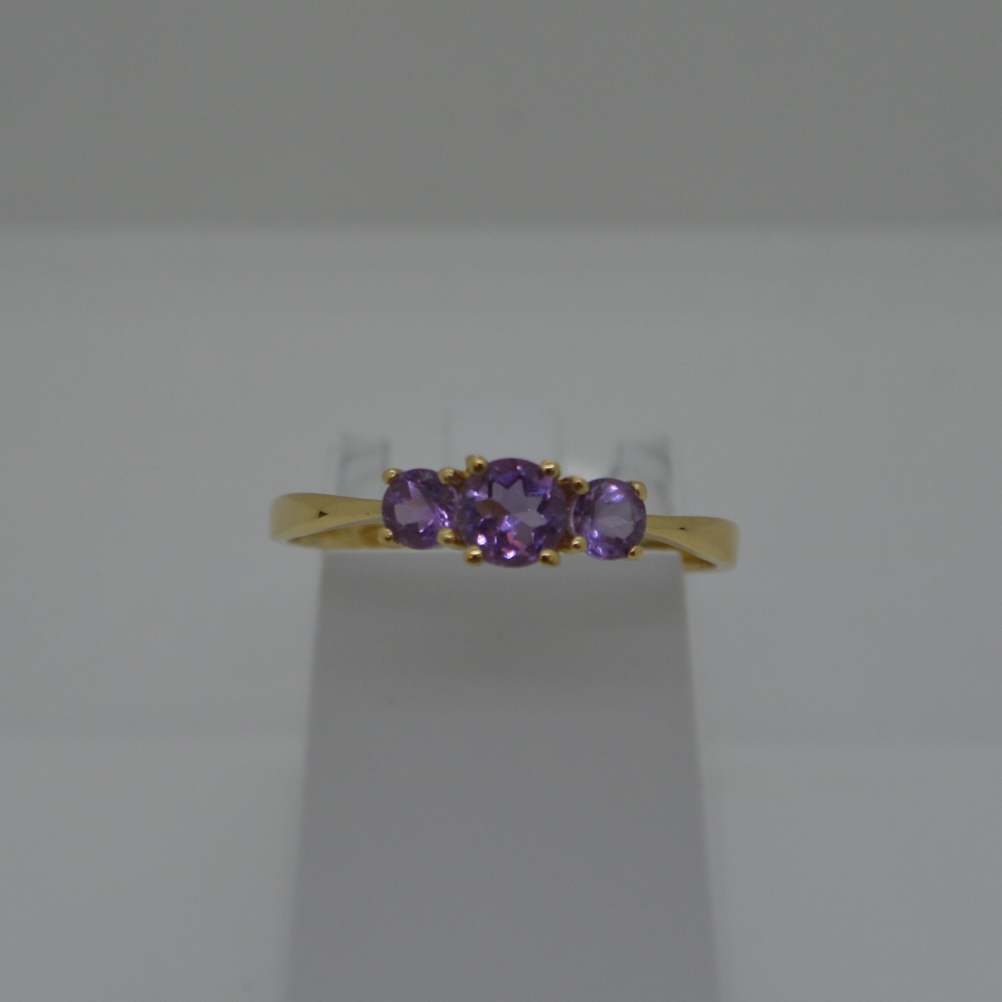Bague 1 Amèthyste ronde centrale Diam. 4mm et 1 Amèthyste de chaque côté Diam. 3mm serti 4 griffes en or jaune 18kt