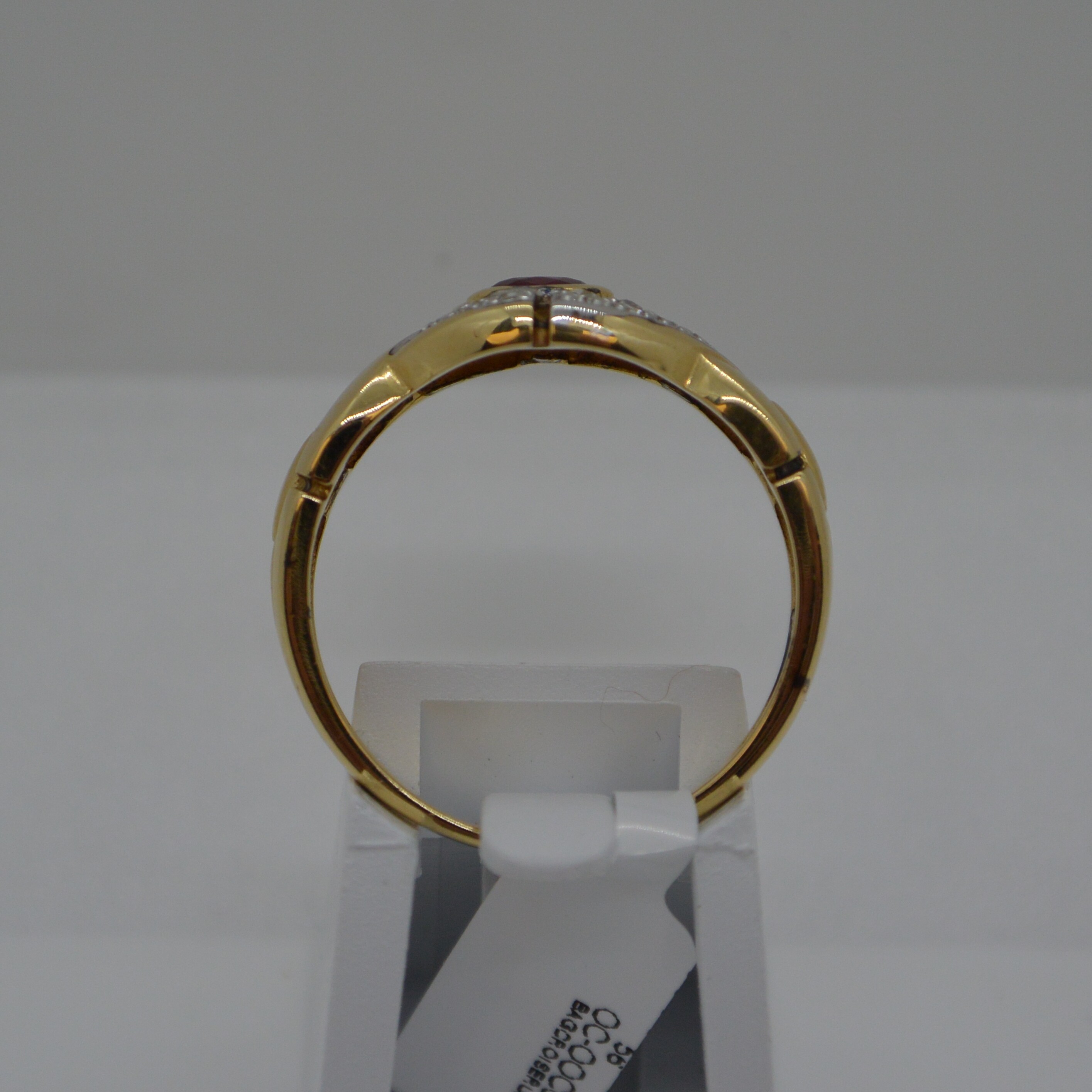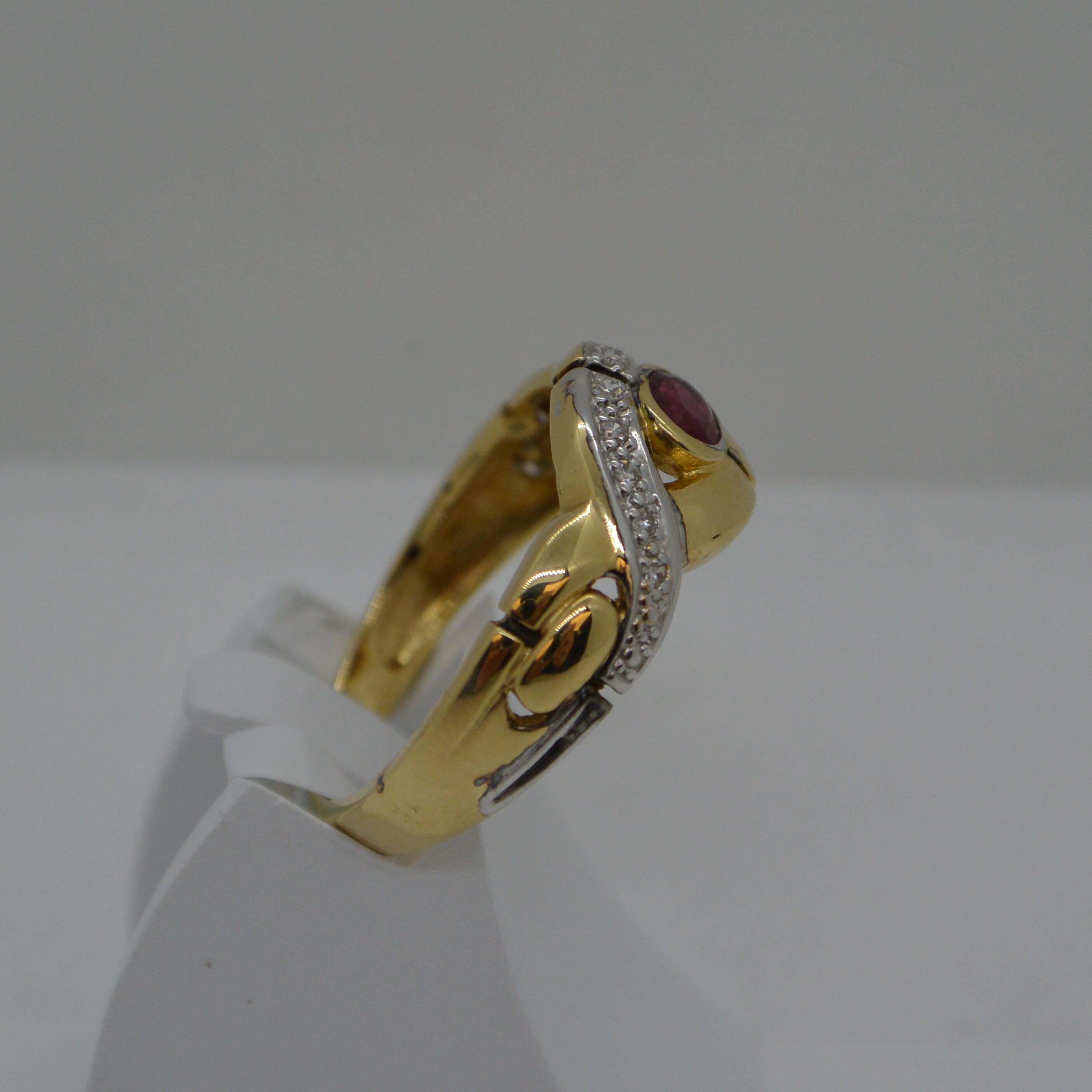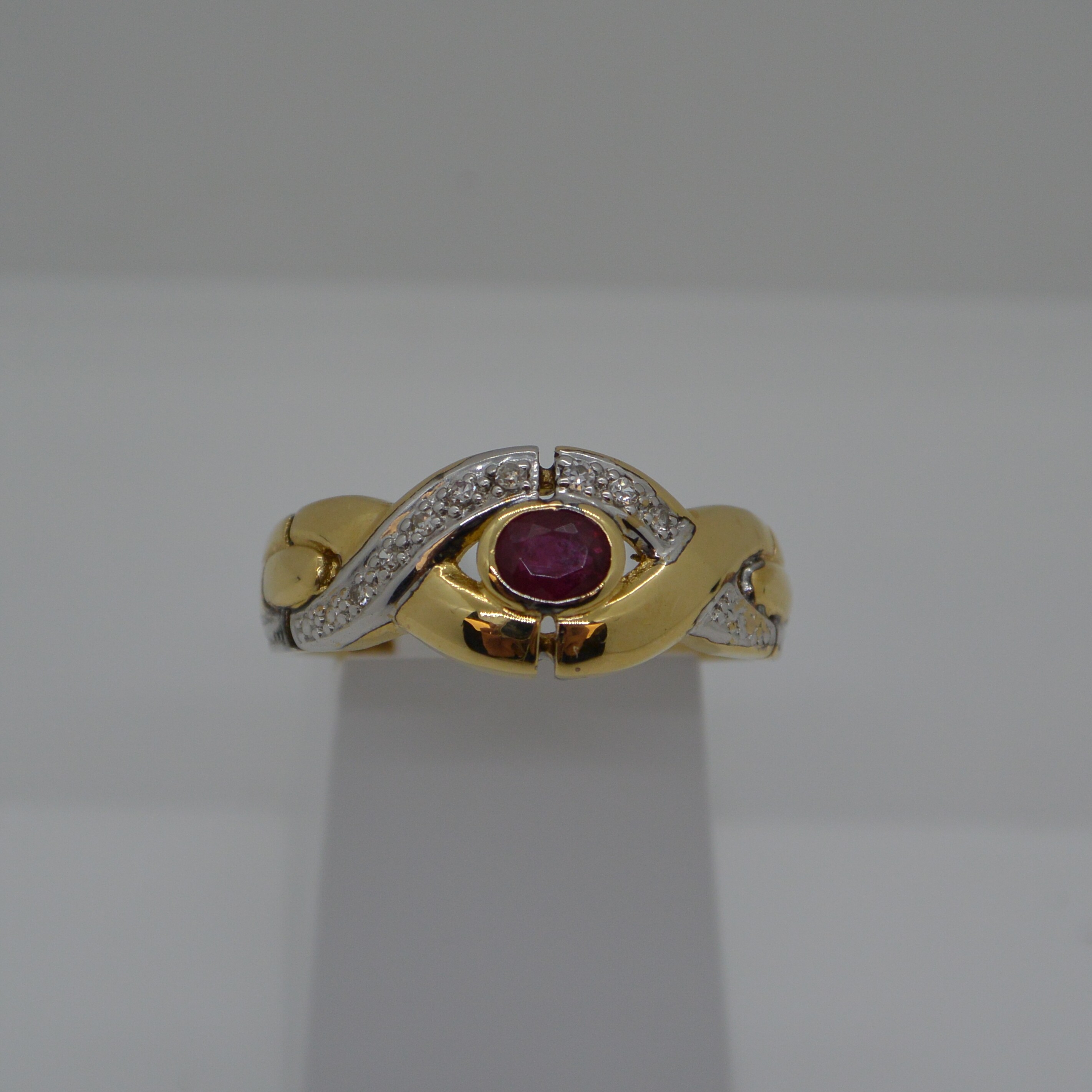 Bague fantaisie ruban croisé 1 Rubis central et Diamants sur les brins en or jaune 18kt et rhodiage