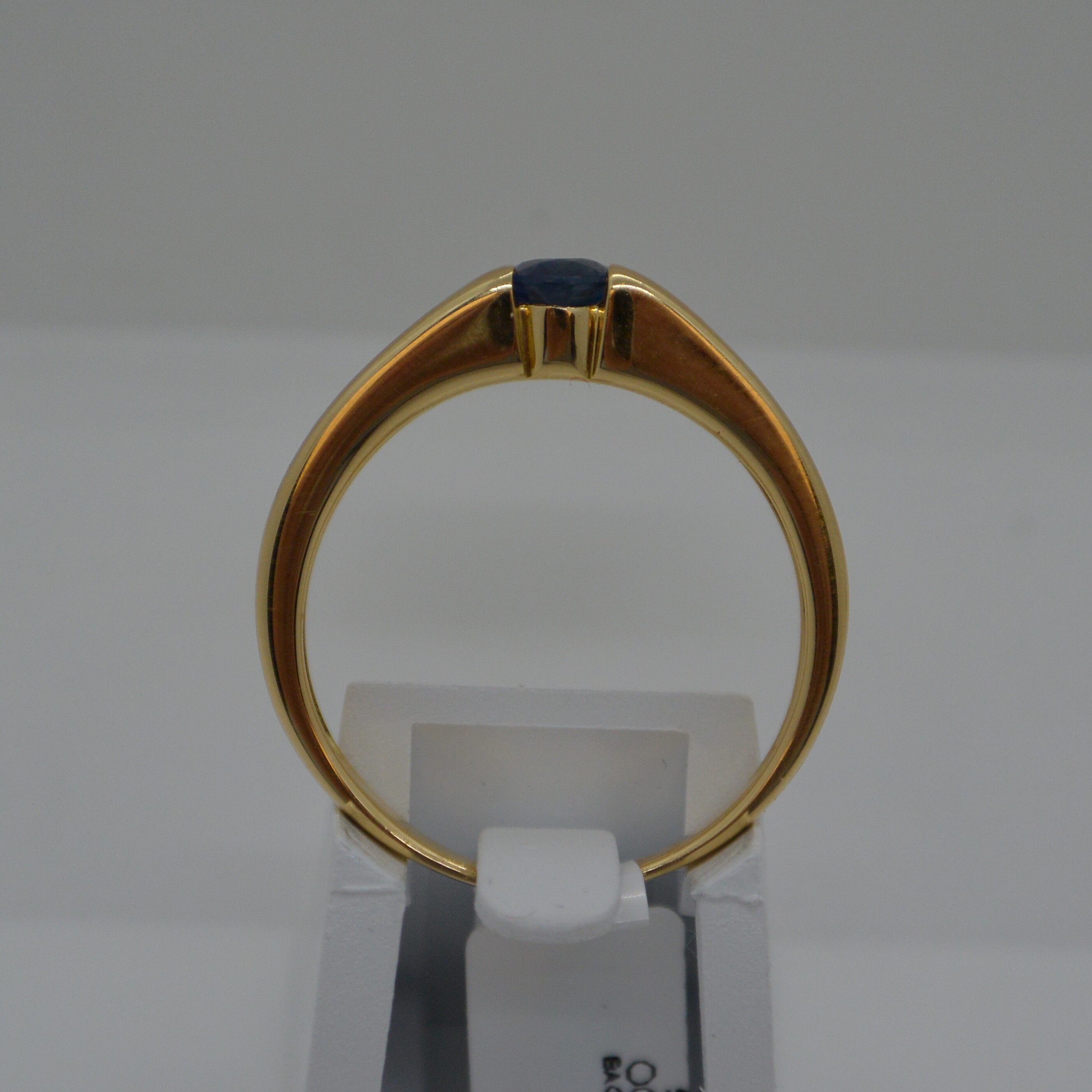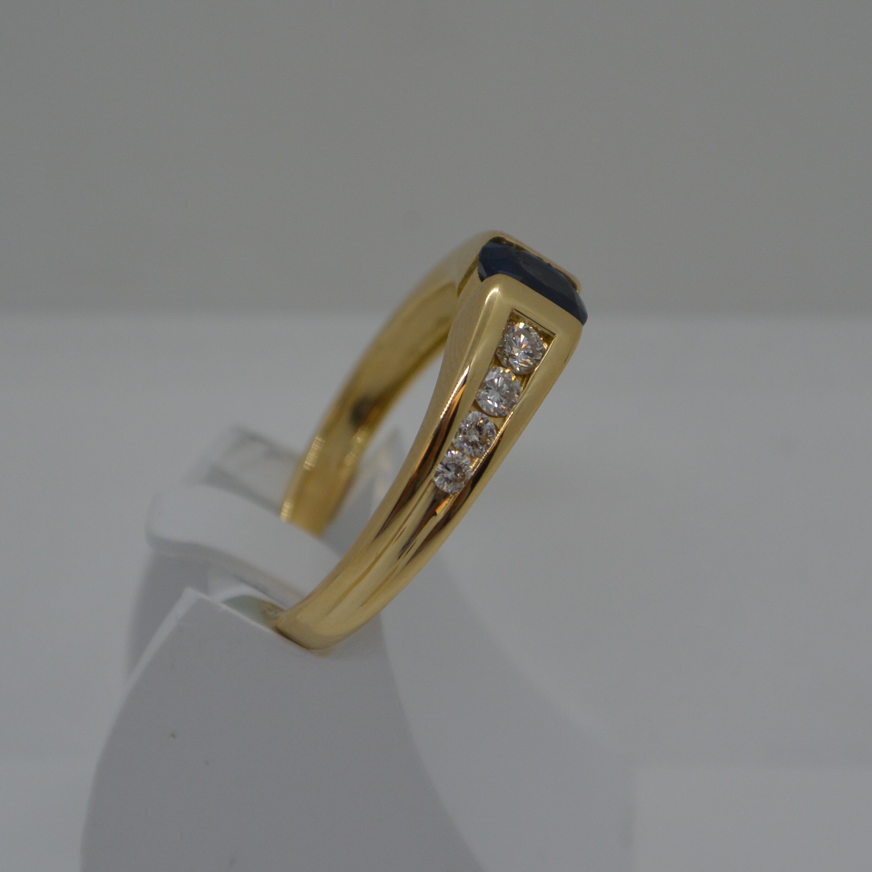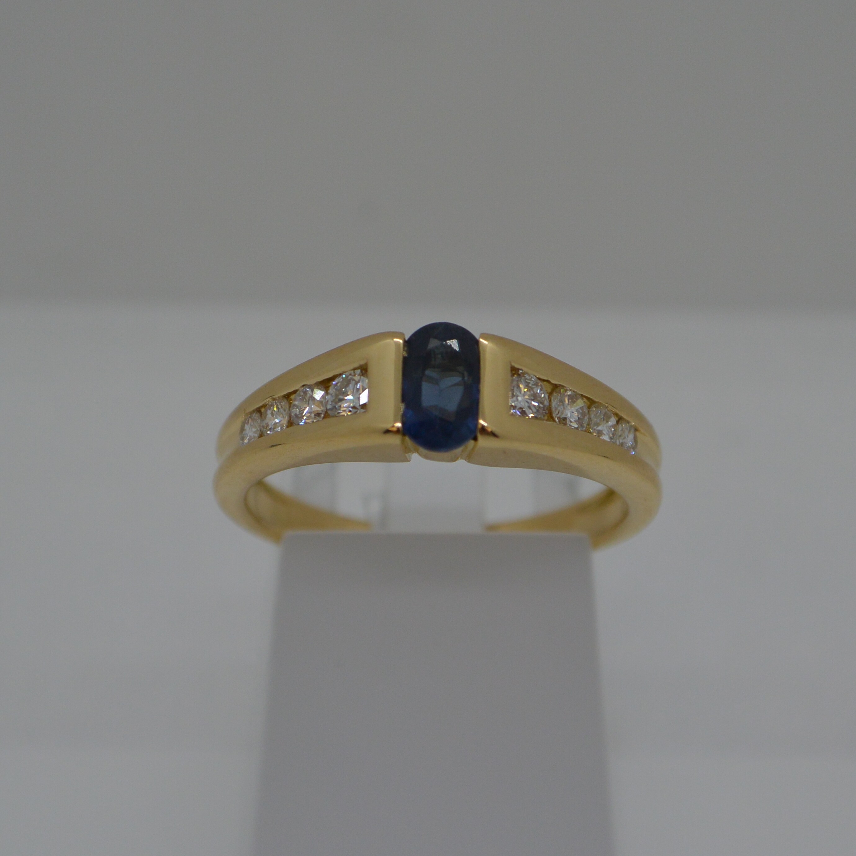 Bague Saphir Ovale central serti demi clos et 4 Diamants serti rail de chaque côté en or jaune 18kt
