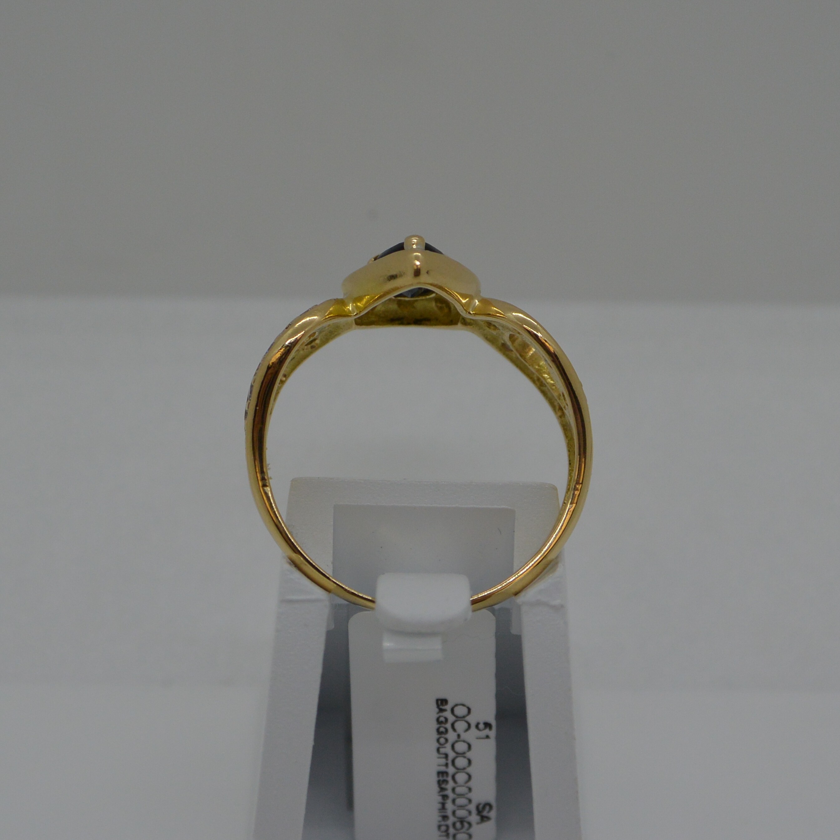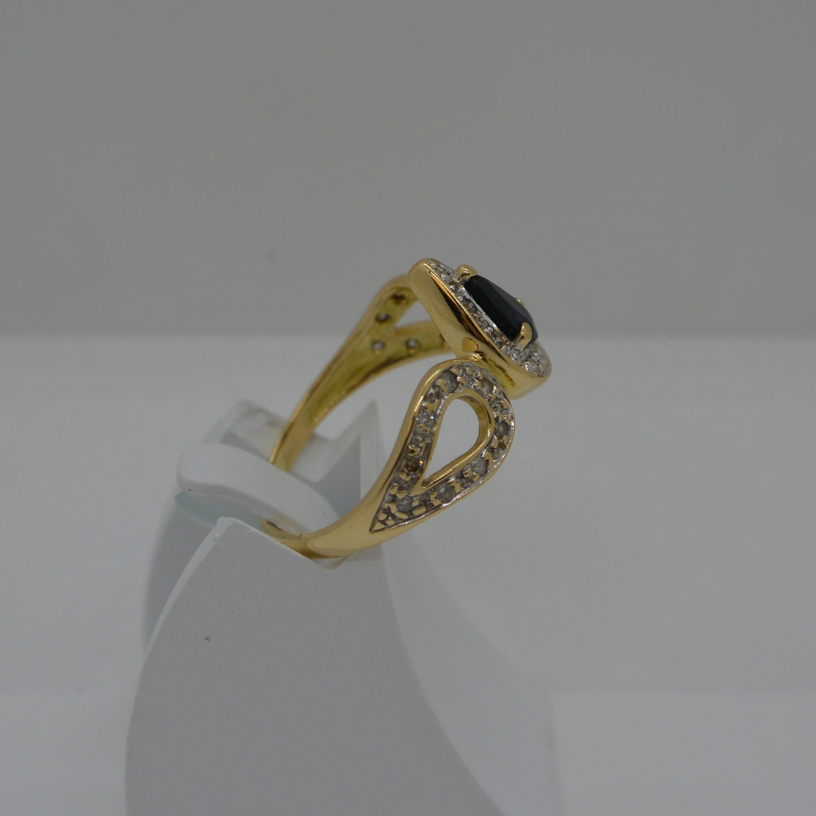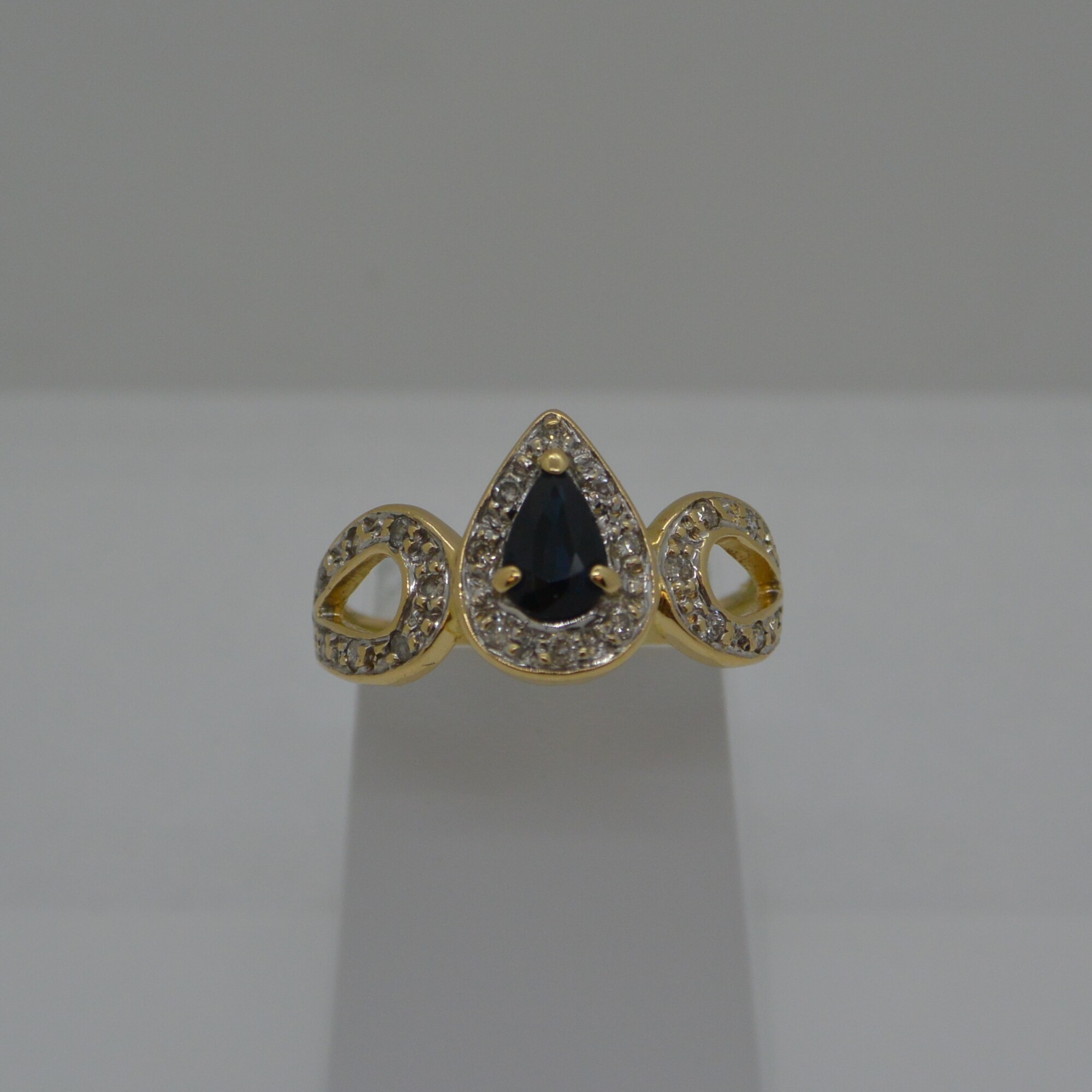 Bague forme goutte avec 1 Saphir Poire central serti griffes et entourage Diamants serti griffes corps fantaisie diamants en or jaune 18kt et rhodiage