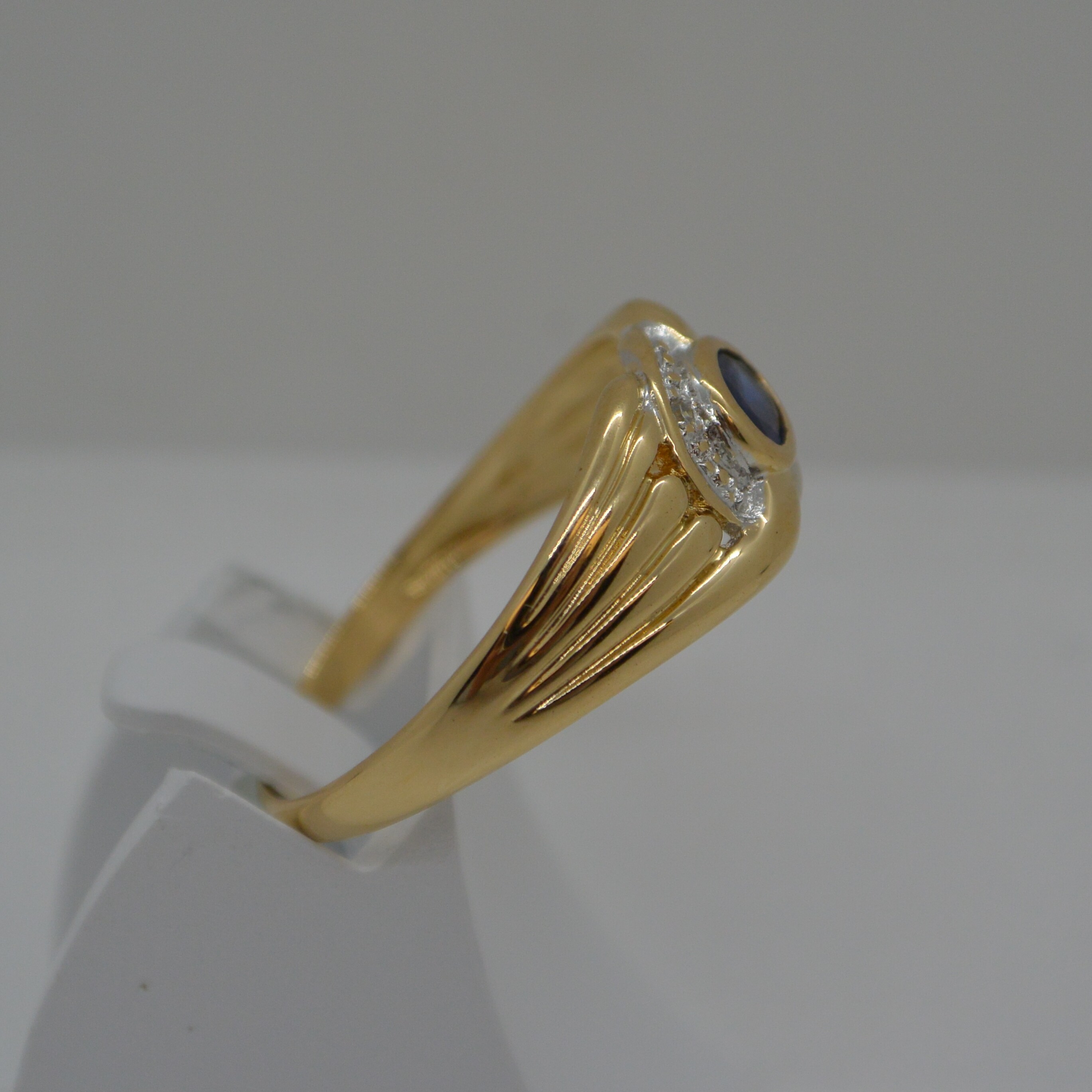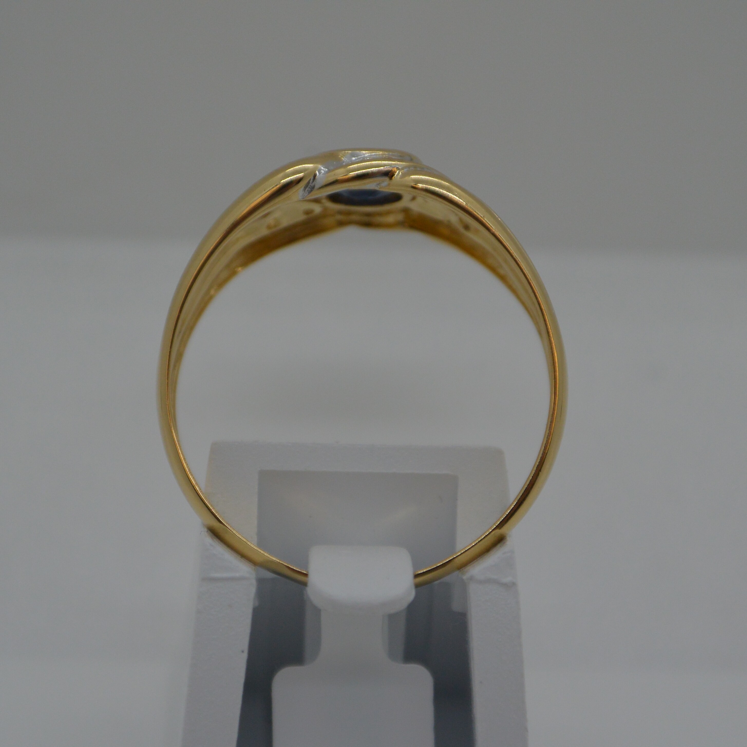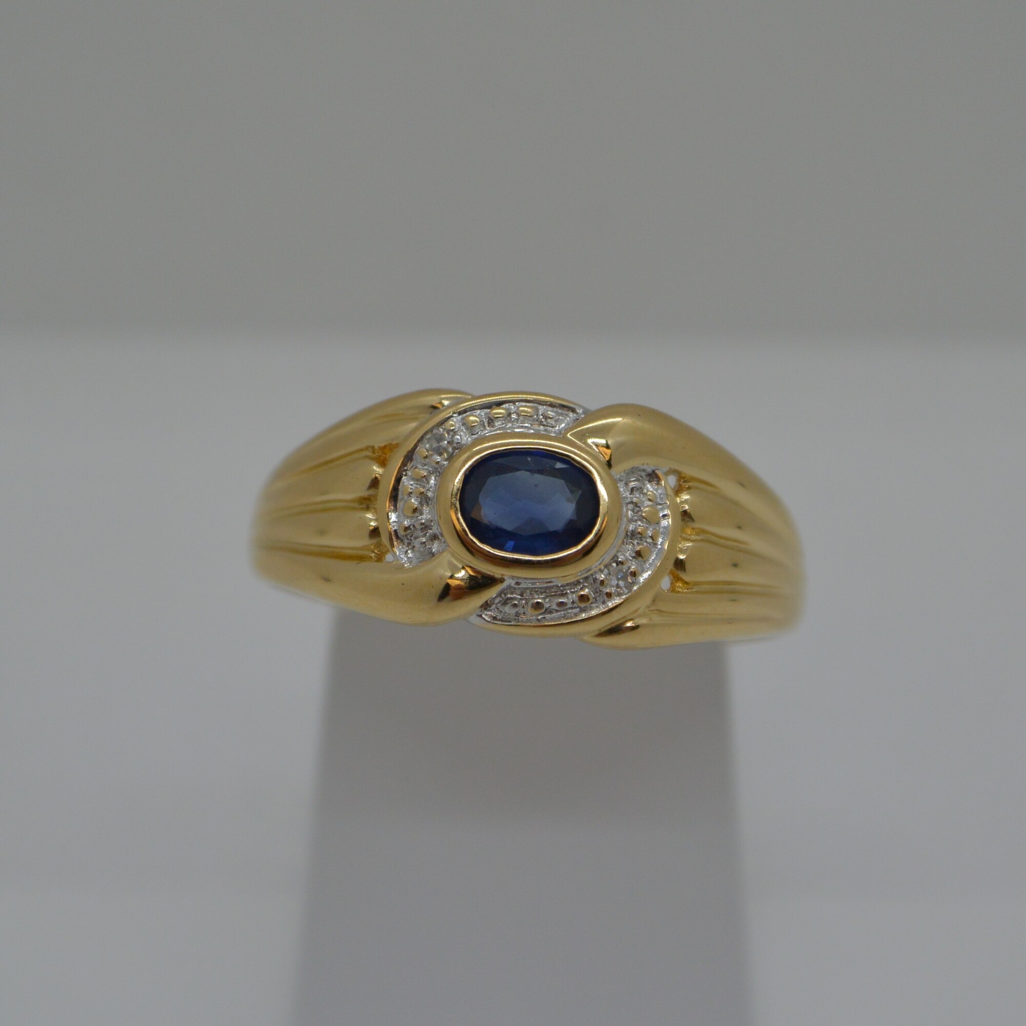 Bague Saphir Ovale Central serti clos et 1 Diamant serti griffe de chaque côté or jaune et rhodié