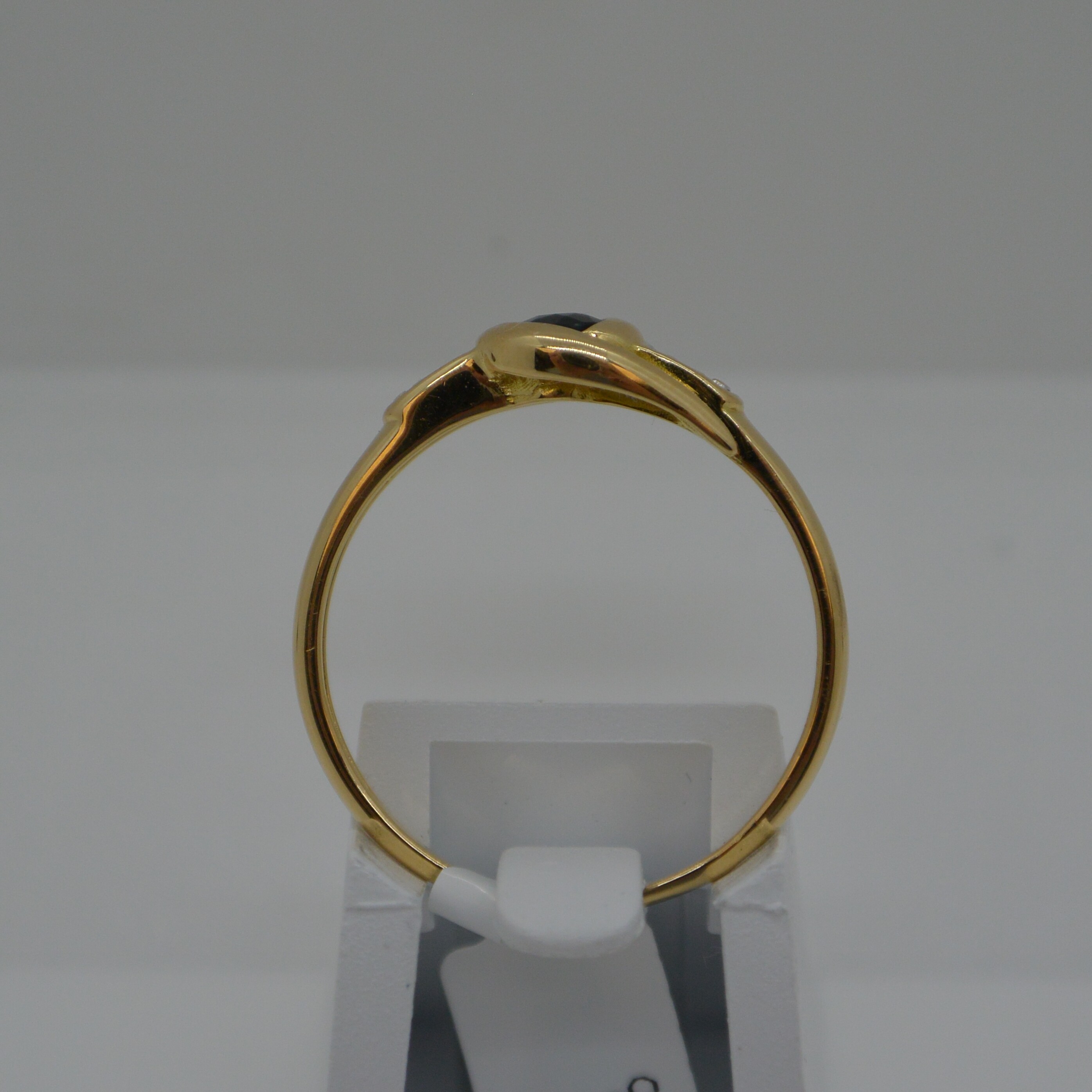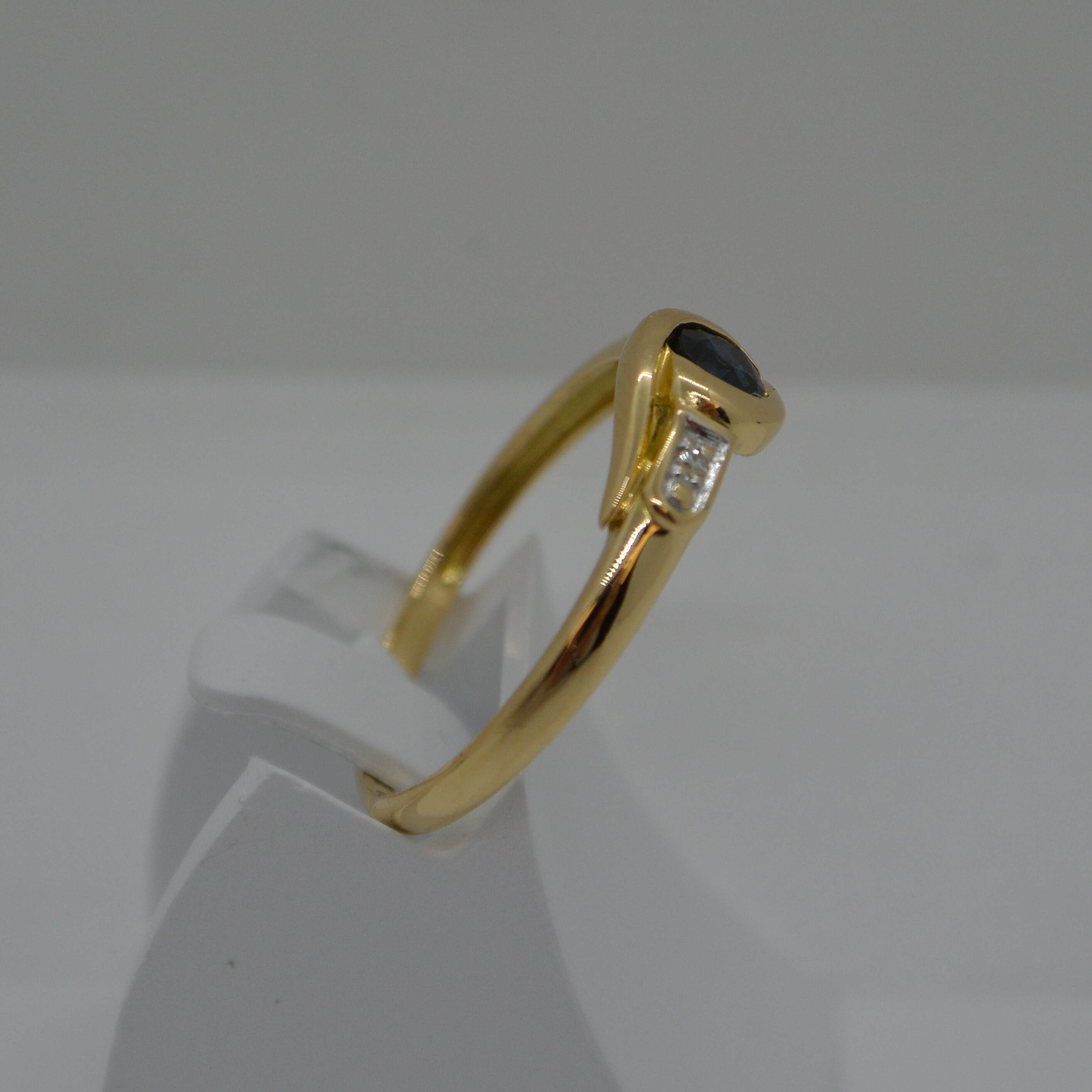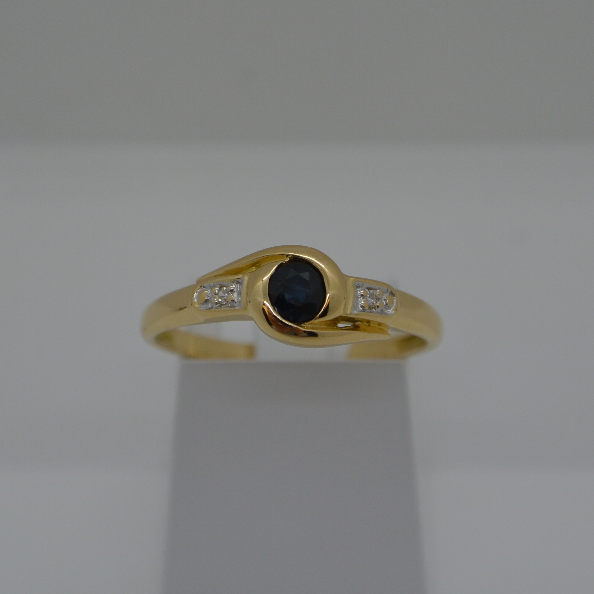 Bague Saphir Rond central serti clos et un Diamant de chaque côté en or jaune 18kt et rhodiage
