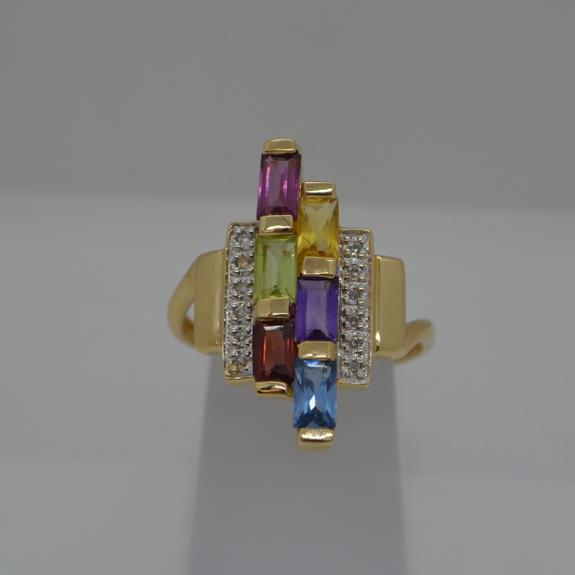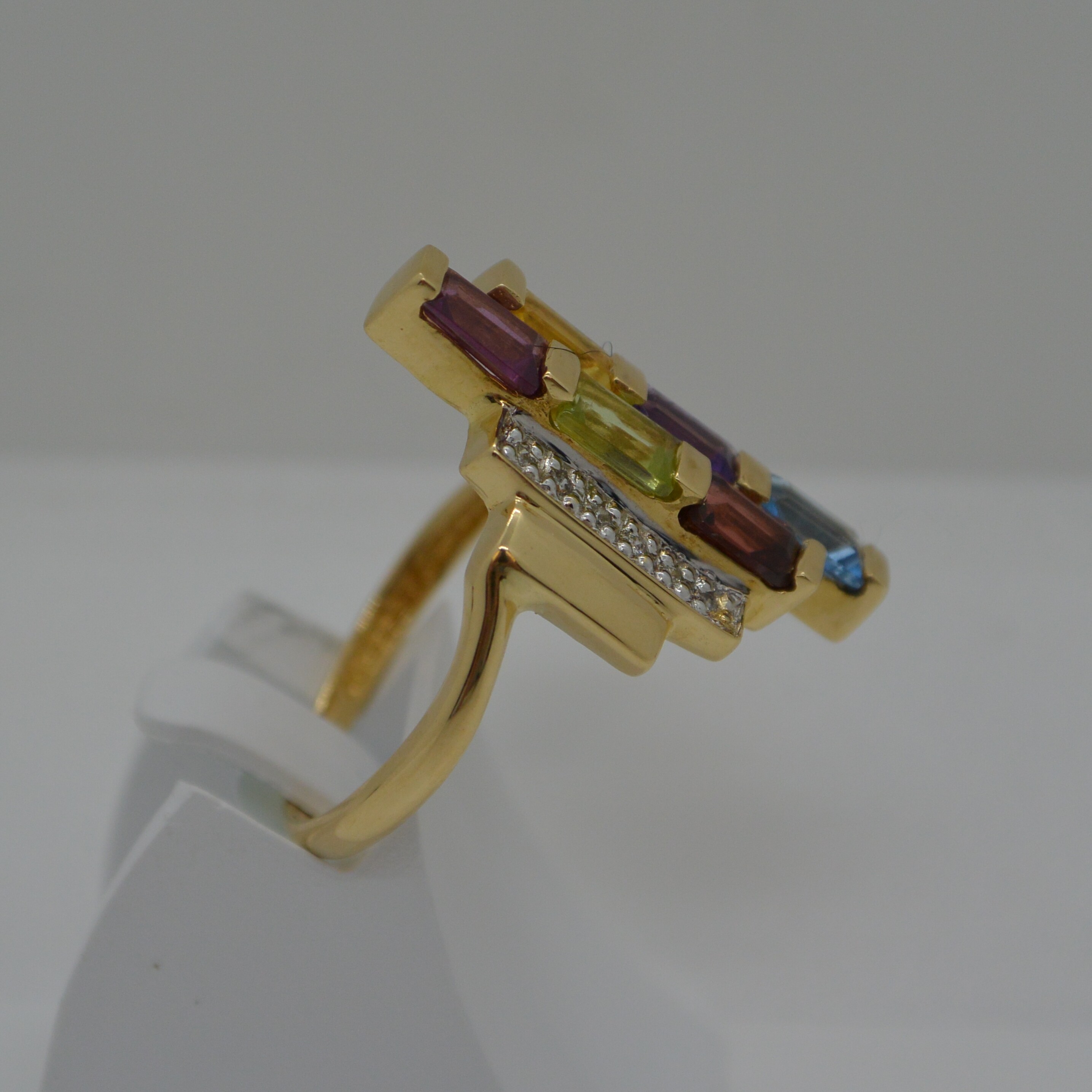 Bague fantaisie Améthyste Topaze Péridot Citrine forme baguette serti demi-clos et Diamants brillants serti 4 griffes de chaque côté or jaune et rhodiage