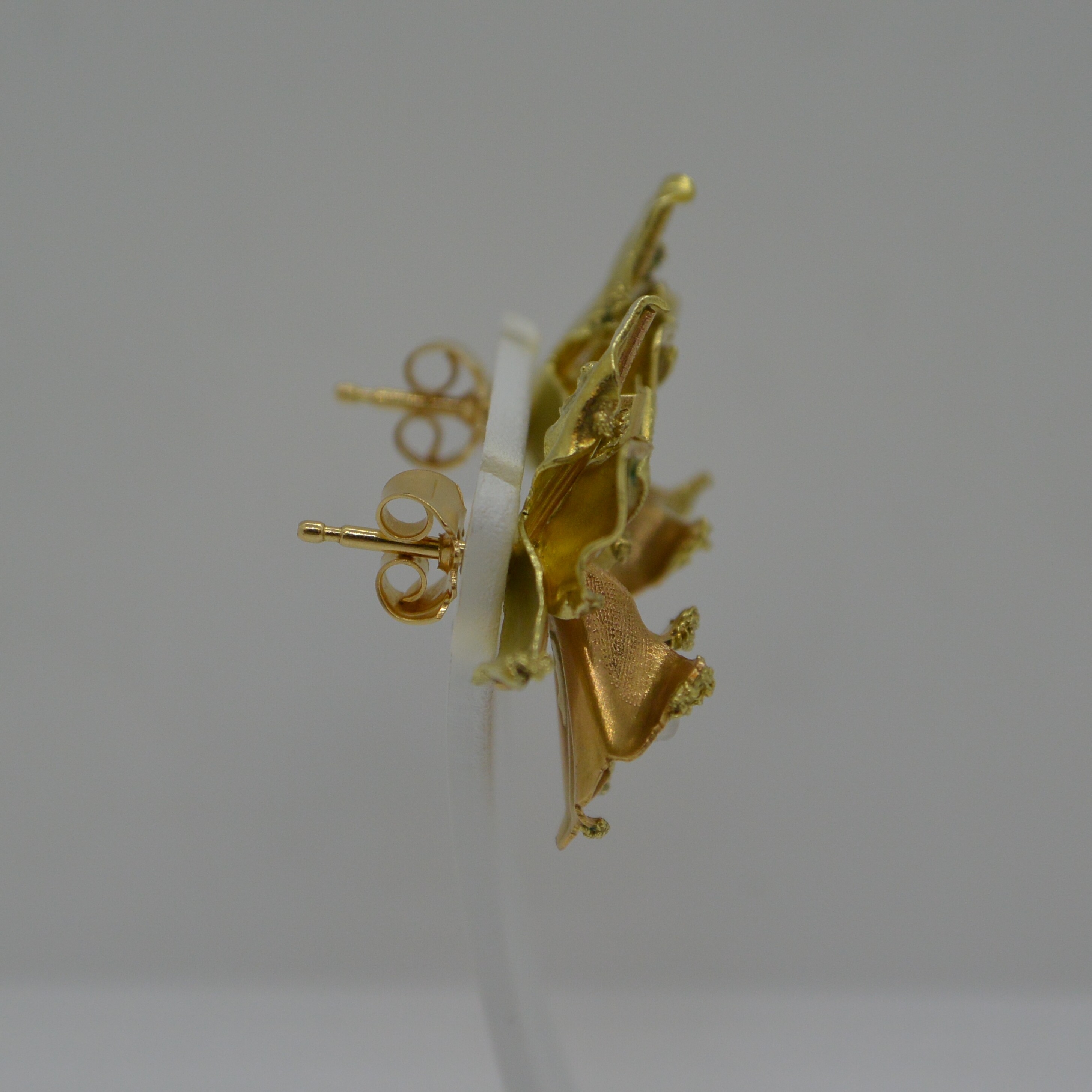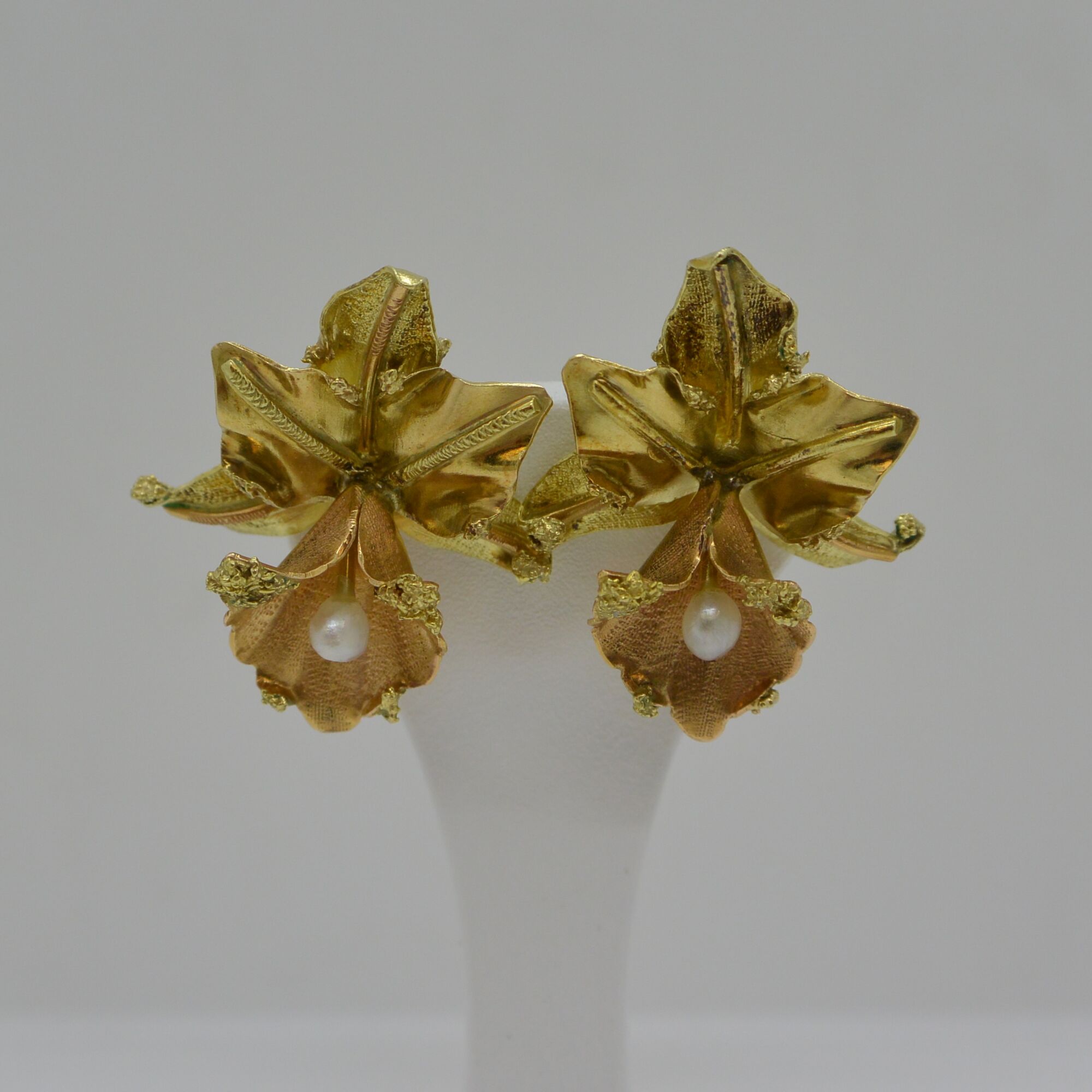 Boucles d'Oreilles Fleur avec une perle blanche au centre fermoir poussette or jaune 18kt