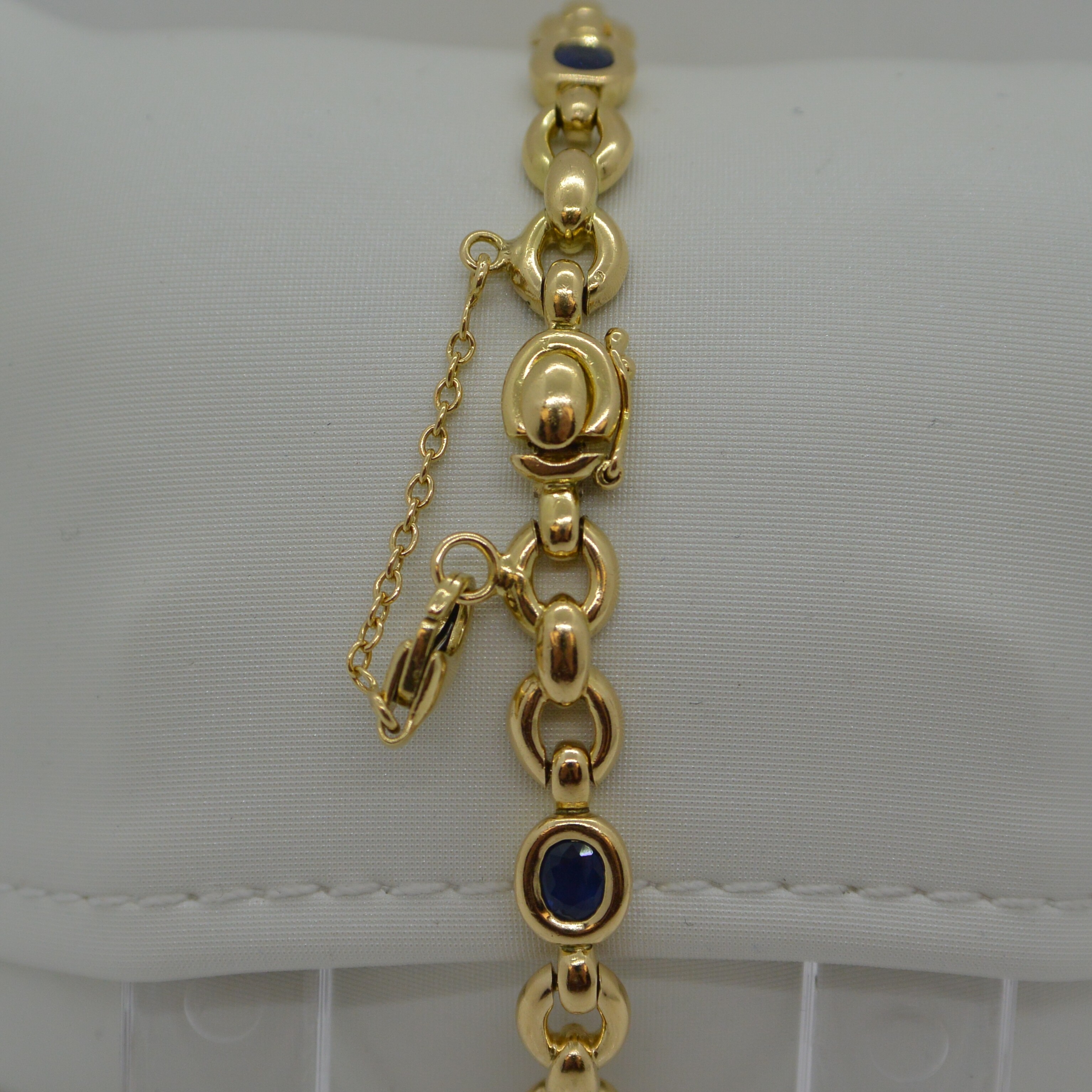 Bracelet maille fantaisie Saphirs Ovales serti clos fermoir cliquet 1 huit sécurité et 1 chaine de sécurité or jaune 18kt
