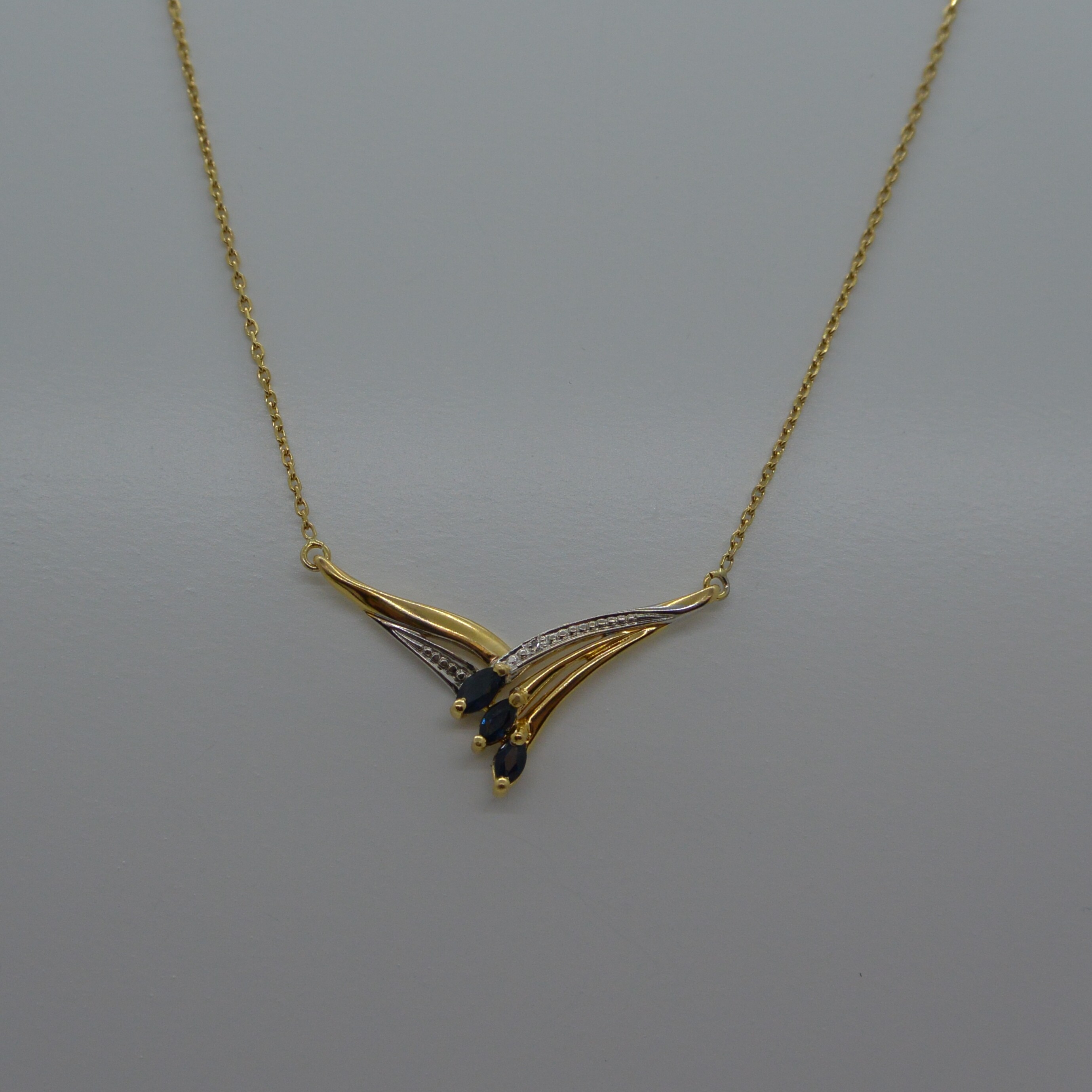Collier chaine maille forçat vagues 3 saphirs navettes serti griffes or jaune 18kt et rhodiage fermoir anneau ressort