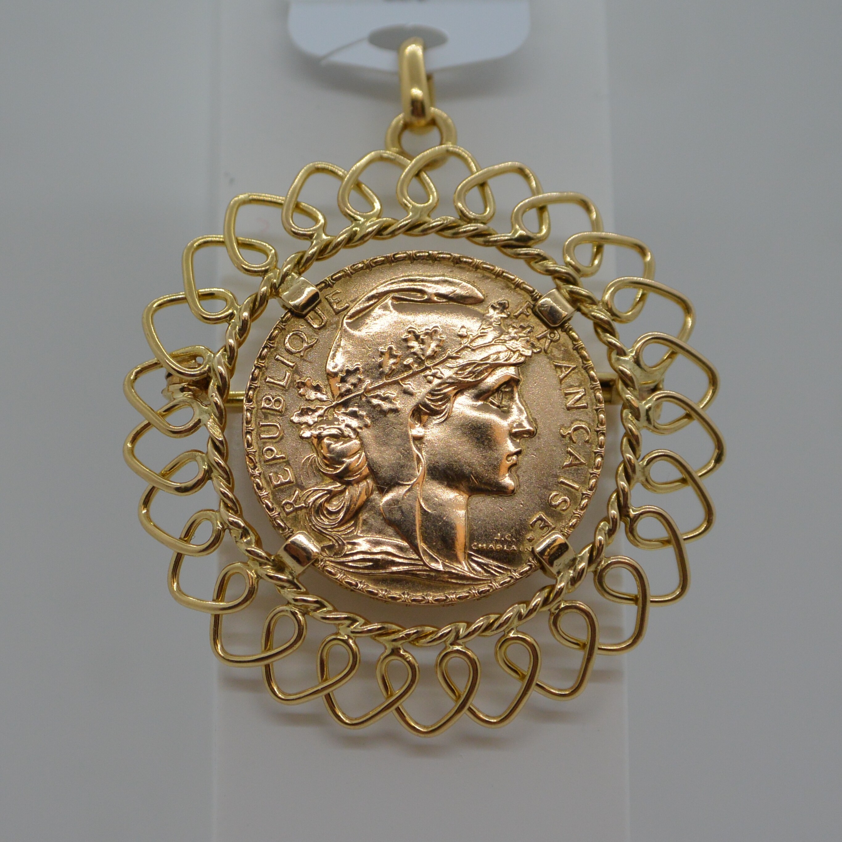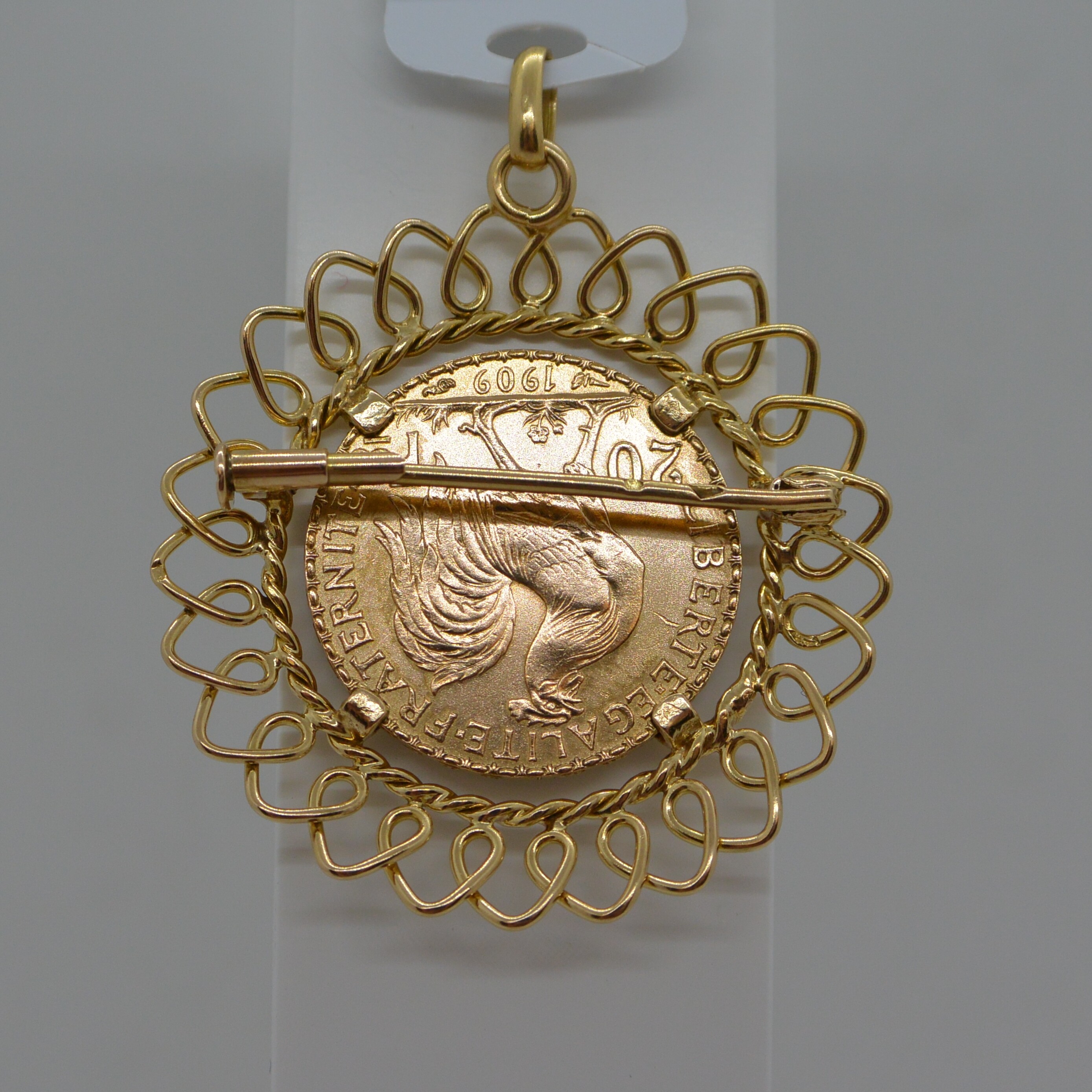 Pendentif / Broche porte pièce de 20Frs Marianne Année 1909 serti 4 grifffes entrourag fantaisie en or jaune 18kt