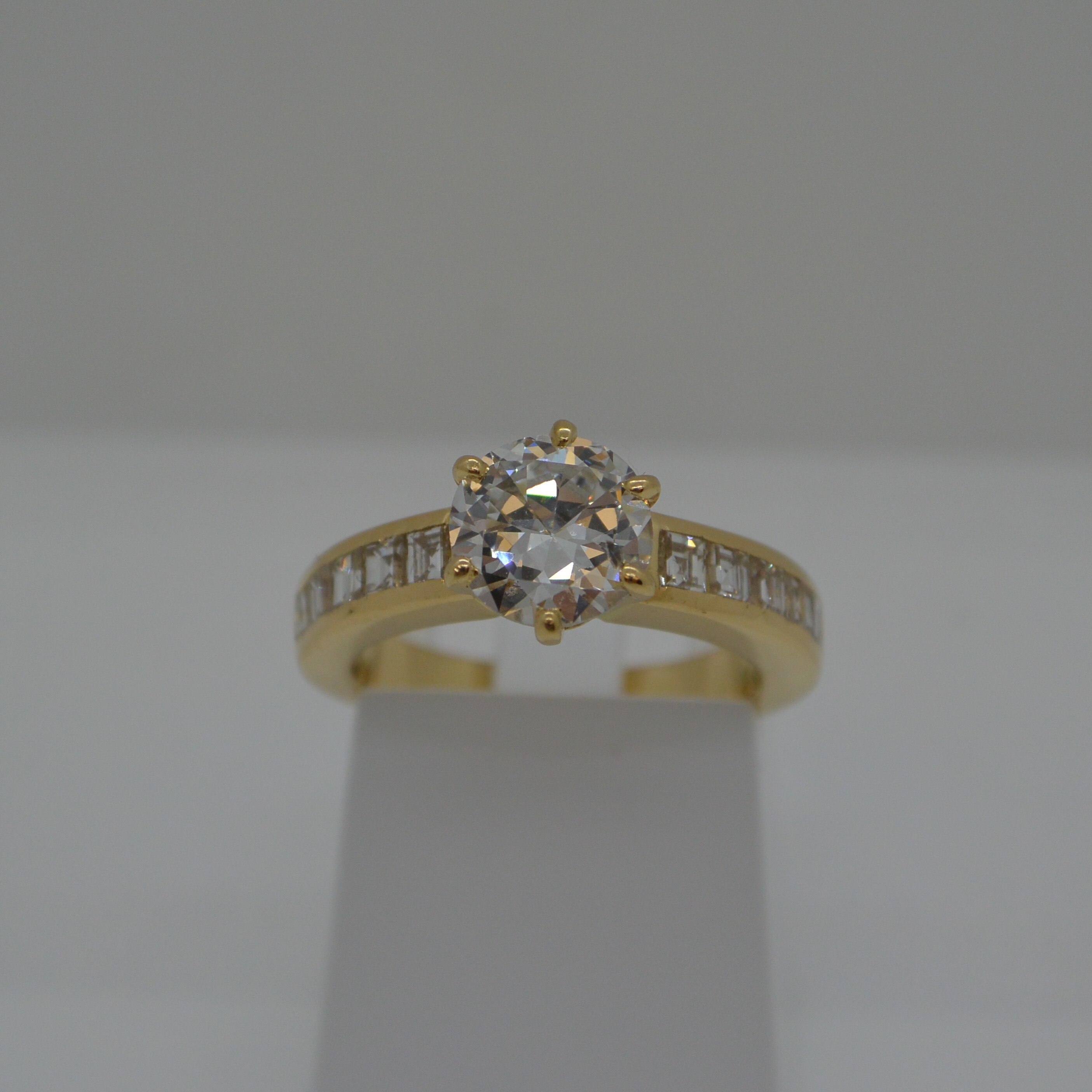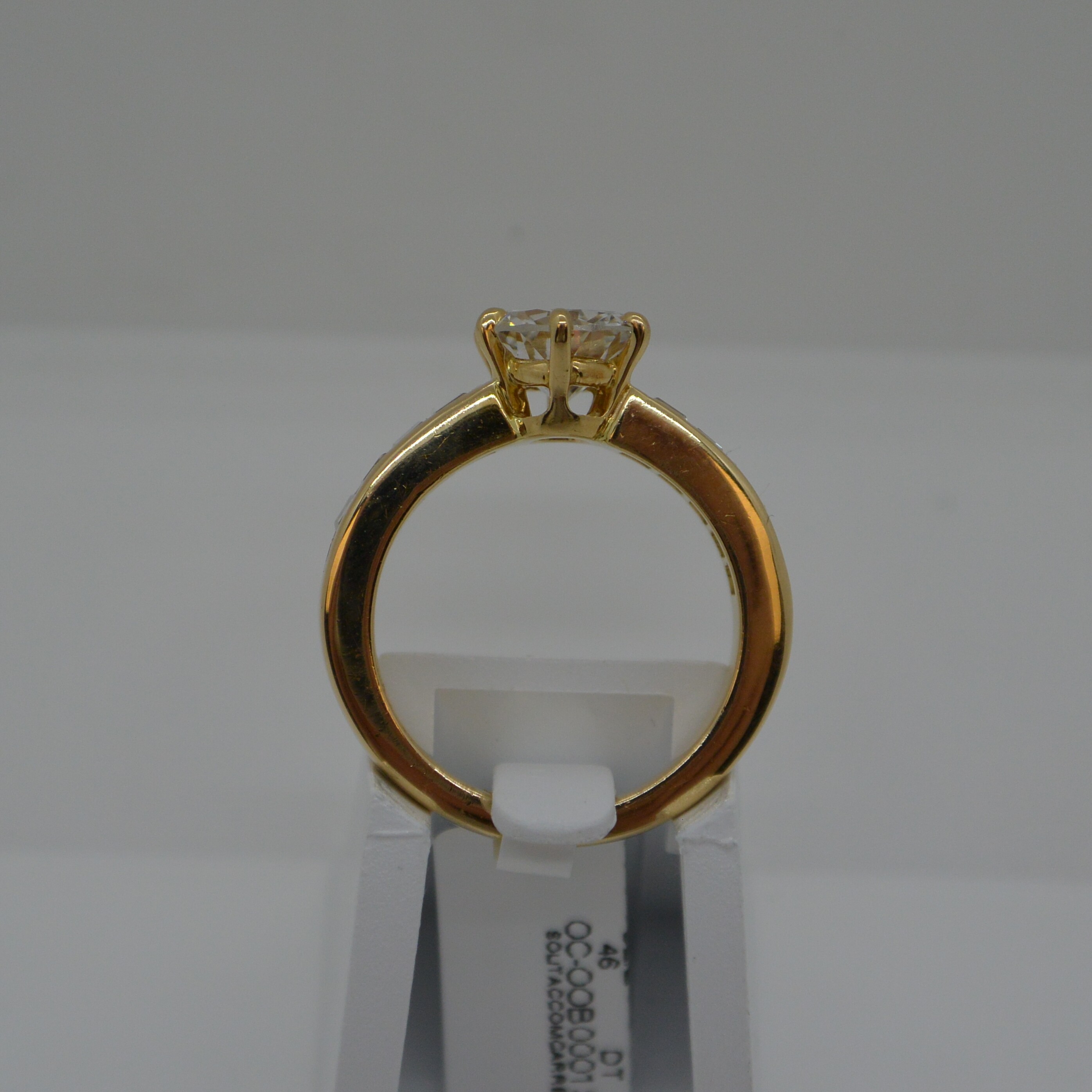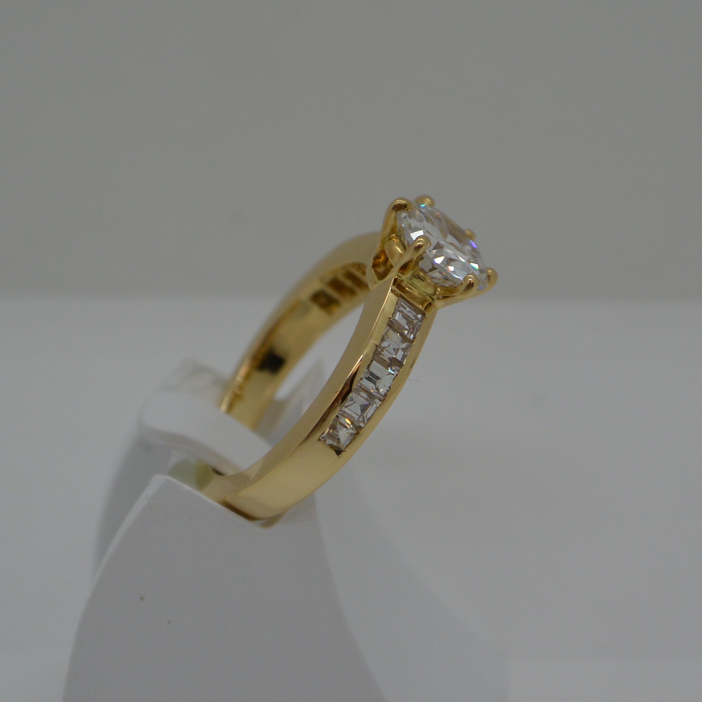 Solitaire accompagné, 1 diamant central Diam. 6.8 serti 6 griffes et 5 diamants carrés 1.6x1.6 de chaque côté serti rail en or jaune 18kt