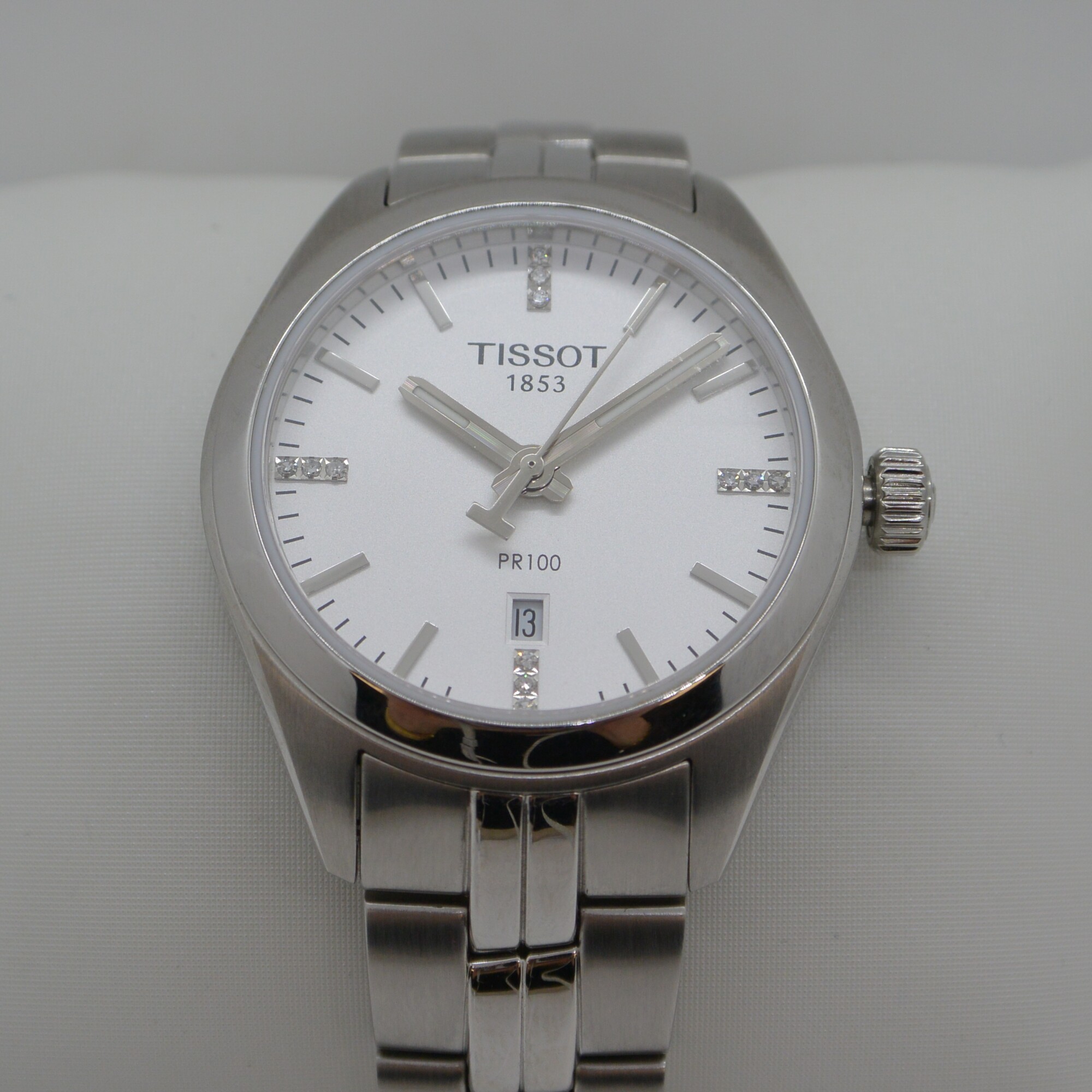 Montre Tissot PR100 dame index diamants 0,05ct Réf : T1012101103600 - cadran couleur argent - mouvement quartz suisse - boitier 33mm - acier inoxydable - verre saphir - étanchéité 100M - boucle déployante